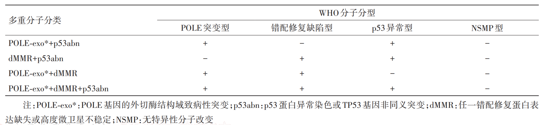 在TCGA分子分型方案中,POLE基因突變 、MSI/MLH1沉默以及TP53基因突變在 POLE超突變型和MSIH型中常存在交叉重疊。雖然大多數(shù)子宮內(nèi)膜癌可以通過使用替代分子分型方案被明確地劃分為單一的分子亞型,但仍存在3.0%~11.4%的子宮內(nèi)膜癌展現(xiàn)出一種以上的分子分型特征,被稱為“多重分子特征”子宮內(nèi)膜癌[2]。