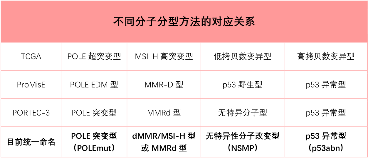 TCGA子宮內(nèi)膜癌分子分型整合了基因組學、轉錄組學、蛋白組學、基因拷貝數(shù)和甲基化數(shù)據(jù),將EC分為POLE超突變型(POLE ultramutated,POLEmut)、微衛(wèi)星高度不穩(wěn)定型(microsatellite instability-high,MSI-H)、低拷貝數(shù)型(copy number low,CNL)、高拷貝數(shù)型(copy number high,CNH)4種亞型。此后很多學者對EC分子分型進行了方法學簡化及流程優(yōu)化,提出了TransPORTEC和ProMisE分子分型策略,分子分型也逐步占據(jù)越來越重要的地位?,F(xiàn)如今分子分型已被國內(nèi)外指南共識所推薦,F(xiàn)IGO 2023新版分期也納入了分子特征[1]。