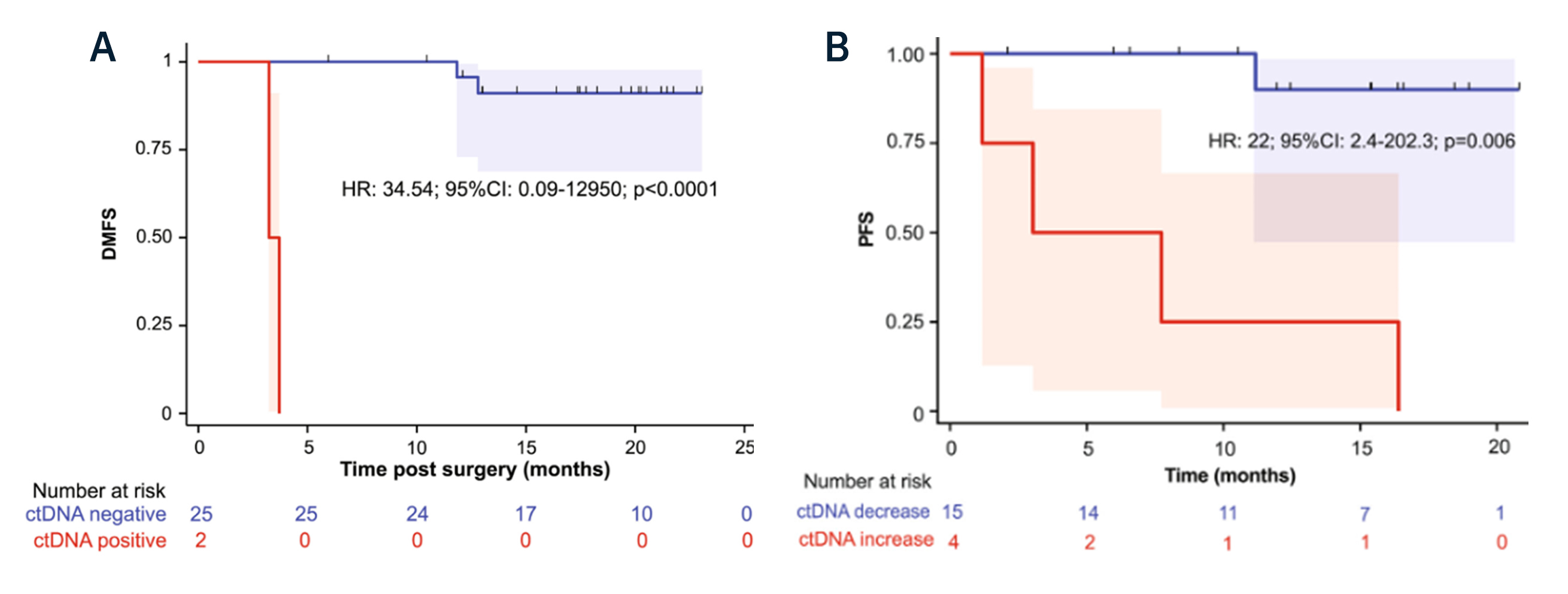2023 年 Eroglu 團隊的研究進一步證實:晚期黑色素瘤患者治療 6 周時,若 ctDNA陽性,其遠處轉(zhuǎn)移風險會增加 34 倍(圖2A);相比基線,ctDNA濃度水平增加組,疾病進展風險增加 22 倍(圖2B)。這意味著,ctDNA 能幫助醫(yī)生更早判斷治療是否 “失效”,及時調(diào)整方案,避免患者在無效治療中浪費時間和精力。